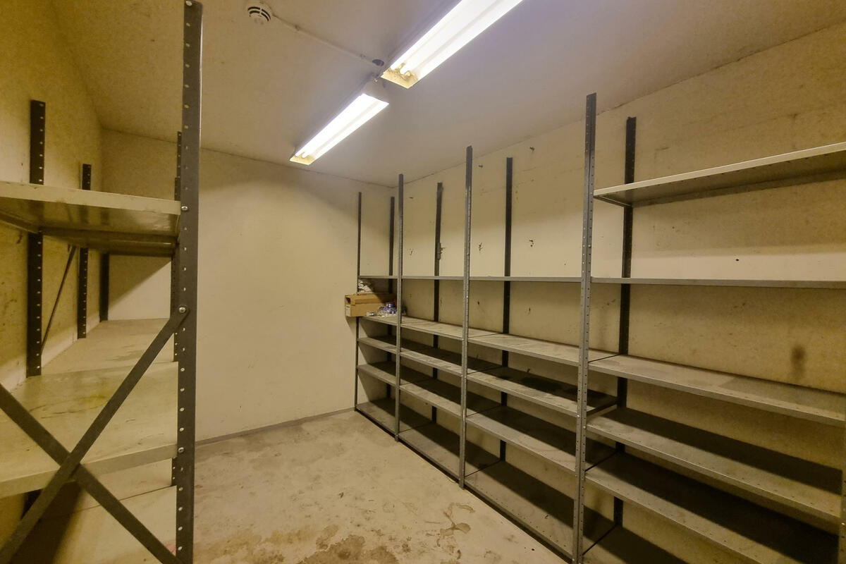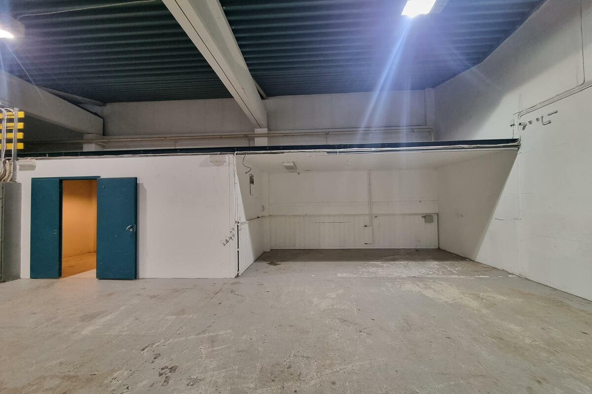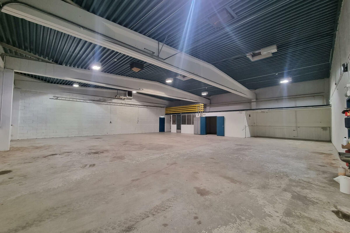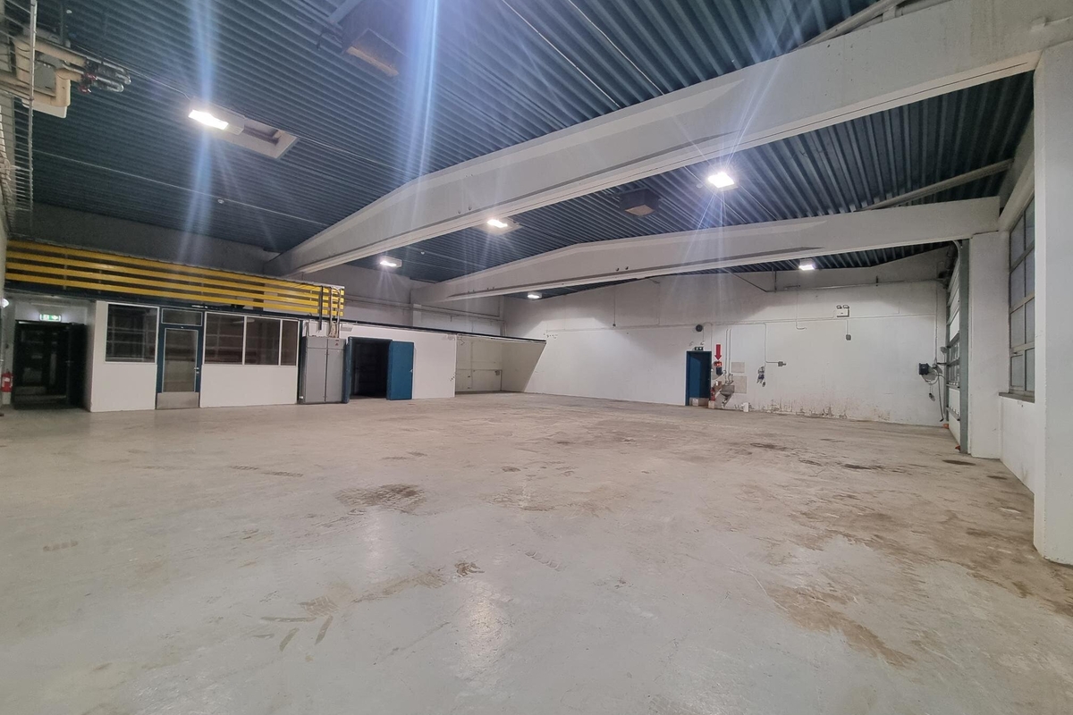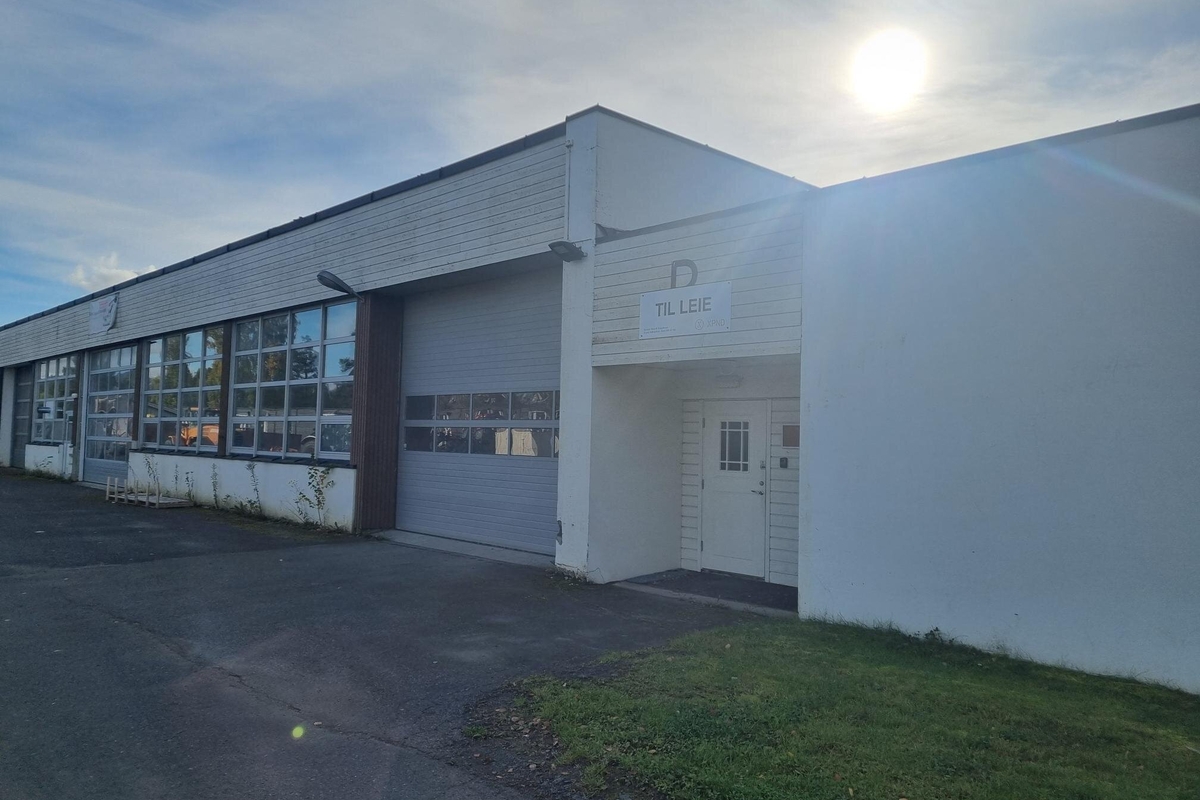 Oppvarmet lagerhall med kjøreport og høyt under taket.